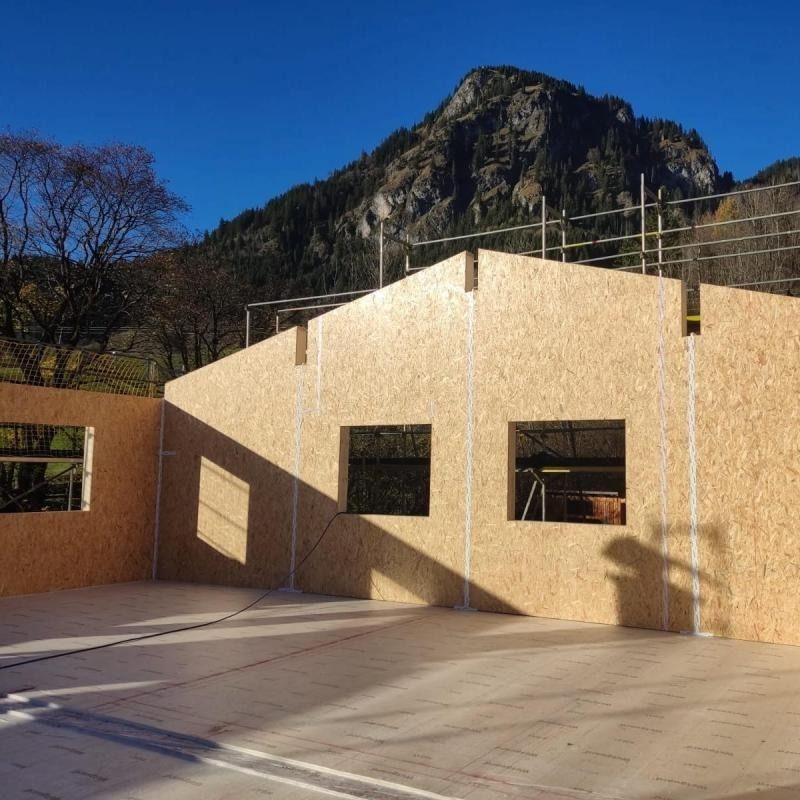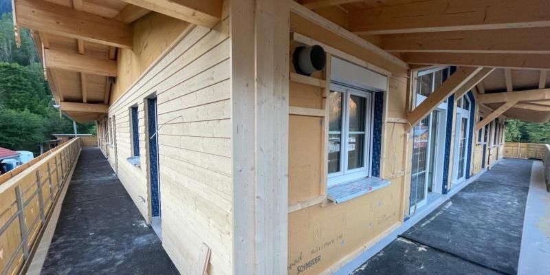 Die Fassade im Dachgeschoss wird angebracht (Juli 2023)