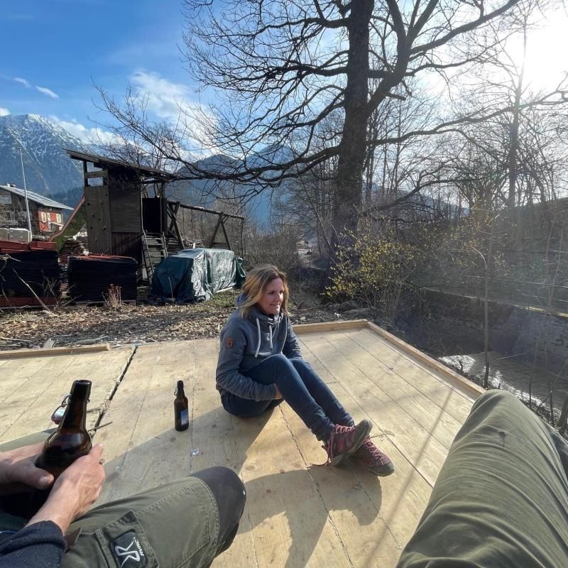 Beim Abriss der alten Gartenhütte im April 2023 entstand auf dem Holzpodest spontan eine kleine Feierabendrunde – und mit dem Satz ‚Hier kann man auch schön sitzen‘ war die Idee für unsere Sonnenterrasse geboren.