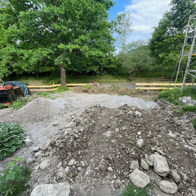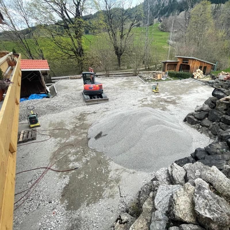 Ein großer Meilenstein – der Hof wird gepflastert, der Schotter verschwindet, und mit jedem Pflasterstein zog Stück für Stück immer mehr das Chalet-Gefühl ein. (April 2024)