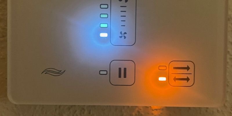 In der Mitte könnt ihr über die Skala die Stärke der Lüftung selbst einstellen. Aus eigener Erfahrung empfehlen wir, die Lüftung in der Nacht auf die niedrigste Stufe zu stellen. Das System arbeitet auf dieser Stufe nahezu geräuschlos und versorgt eure Schlafzimmer trotz geschlossener Fenster und Jalousien mit ausreichend frischer Luft. Solltet ihr zum Beispiel im Sommer das System nicht benötigen, da ihr eh immer die Fenster aufhabt, dann könnt ihr die Lüftung unten in der Mitte über das Pausensymbol komplett ausschalten.